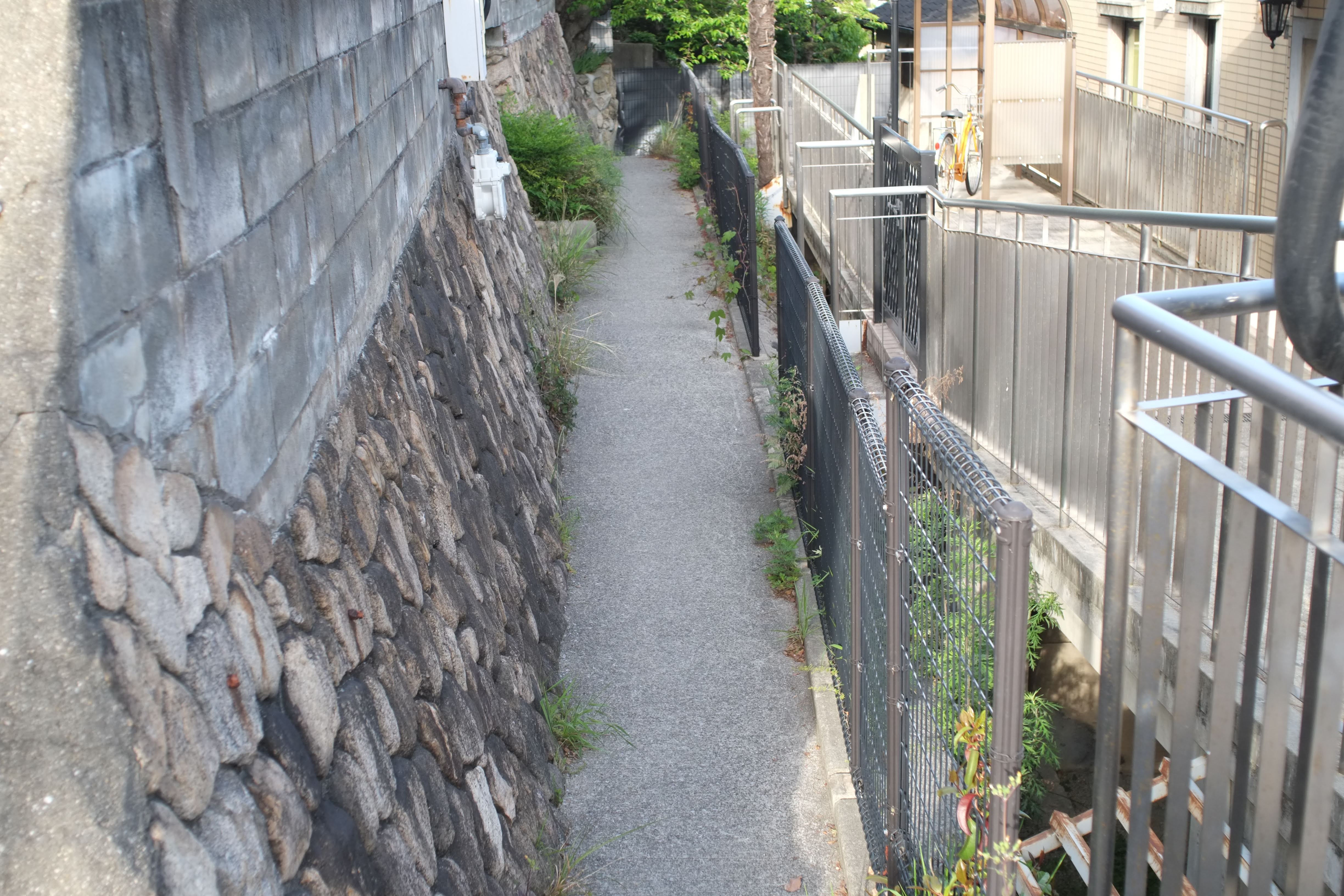 滴翠美術館で戦前のお金持ちの真髄みたいなものをたっぷり(予定時間をオーバーして)味わった後は、折り返して摂津名所図会に薬師堂として紹介されている場所を目指します。少し西に向かいつつ、坂を降りて行くと、緑色の塔屋がかわいいヴィンテージマンションが見えてきました。このマンションが建っている場所に、かつての薬師堂があったということです。この場所も、明治以降の宅地開発の中で、一度は邸宅(薬師堂は現在の芦屋神社の東に移されたとのこと)となり、その後1960年代に「芦屋アーバンライフ」というマンションが建てられました。この周囲はもともとの集落だっため、新しく開発された山手の宅地に比べて、それほど大きな敷地の家はないのですが、寺院という広い土地があったので、敷地の広い邸宅とその後のマンションが建てられたのでしょうね。