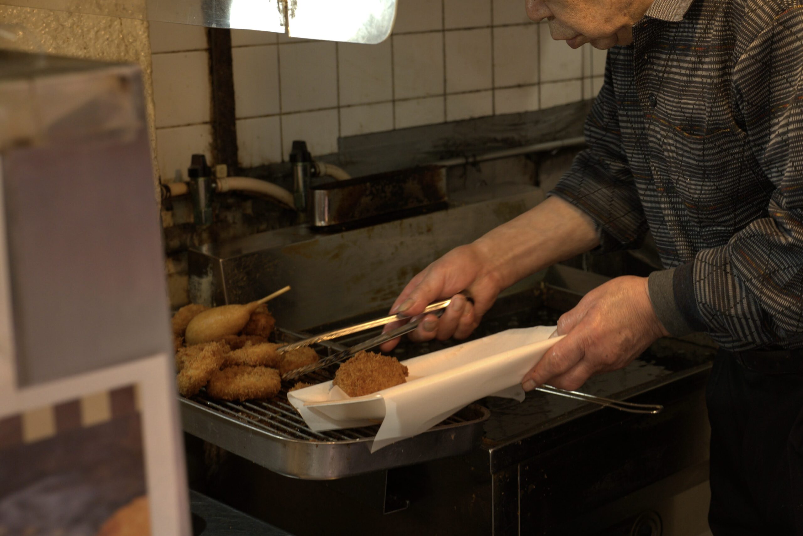 ここからバザール明舞のお肉屋さん「きくや食品」へ移動。バザール明舞は明舞団地の南部にあるゲタバキの商店街です。この商店街できくや食品さんは50年以上営業されているとのこと。コロッケなどをその場で揚げてくれるのですが、圧倒的な種類の豊富さで、ポテトサラダコロッケといった珍しいものもあり目移りしてしまいます。なんとか各自お昼のおかずを選んだところに「ここは焼き豚も美味しいんですよ」という神吉さんの囁き。全員が晩御飯に焼き豚を買って帰ることになりました。